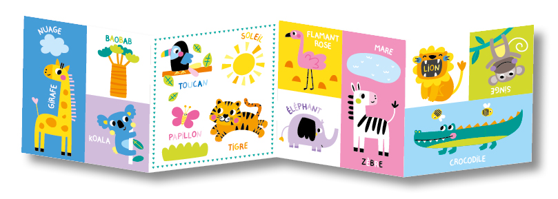 Ce livre accordéon grand format se déplie recto verso : d’un côté 6 grands dessins à peindre avec un pinceau magique à l’eau et de l’autre côté un imagier joyeux et coloré, pour découvrir de nouveaux mots de vocabulaire. Déplié, ce joli accordéon fait une belle décoration dans la chambre de l’enfant.