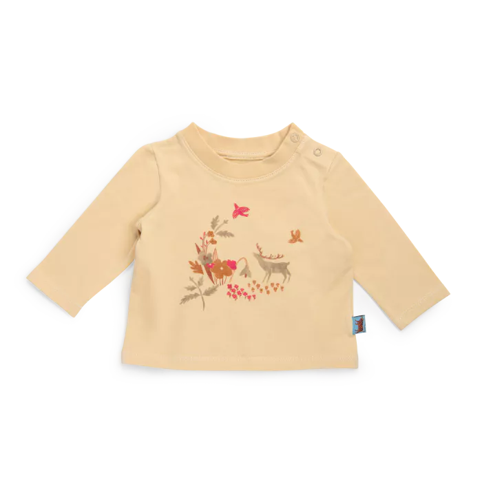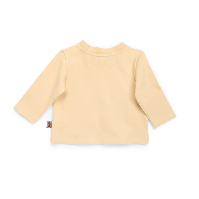 T-shirt à manches longues en jersey de coton beige, avec son imprimé de la jungle merveilleuse. Bouton pression contrasté aux épaules, facile à enfiler.